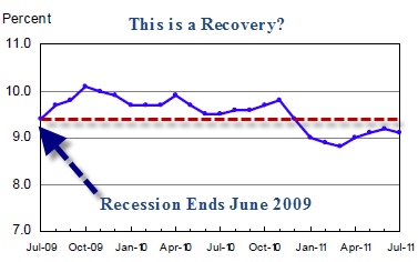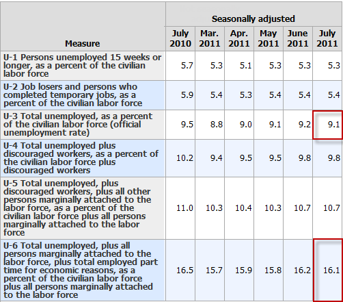 While the "official" unemployment rate is an unacceptable 9.1%, U-6 is much higher at 16.1%.