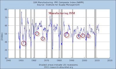 There are many false signals on manufacturing ISM, where a contraction does not imply a recession. Other manufacturing ISM charts show the same noise.