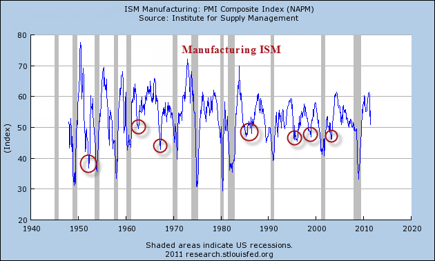 There are many false signals on manufacturing ISM, where a contraction does not imply a recession. Other manufacturing ISM charts show the same noise.