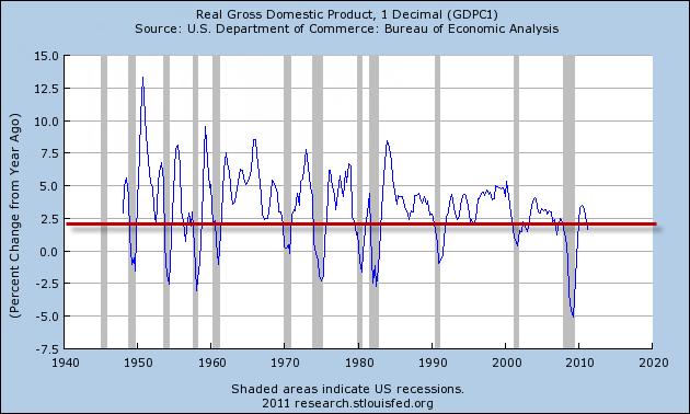 Nearly every time Real GDP dips below 2%, the economy was either in recession or headed for recession.