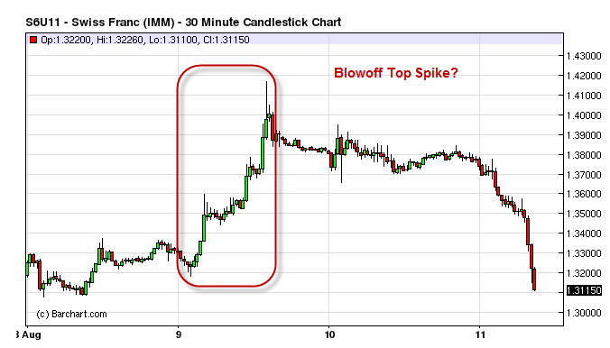 That last spike up has the look and feel of and end gasp of a parabolic rise. However, one cannot be certain at this time. Note that the discussed peg is a Swiss Franc peg to the Euro, not to the US dollar.