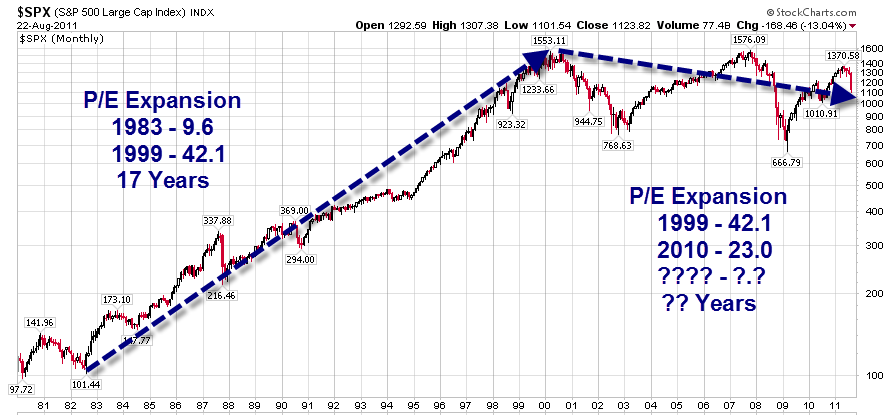 Starting in 1965 there was P/E compression for 18 years. Staring in 1983 there was P/E expansion for 17 years. That marked capped the biggest bull market in history.
