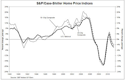 The S&P/Case-Shiller U.S. National Home Price Index, which covers all nine U.S. census divisions, recorded a 5.9% decline in the second quarter of 2011 over the second quarter of 2010. In June, the 10- and 20-City Composites posted annual rates of decline of 3.8% and 4.5%, respectively. Thirteen of the 20 MSAs and both monthly Composites saw their annual growth rates improve, although remaining in negative territory in June.