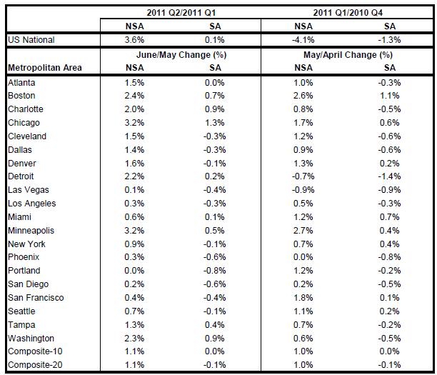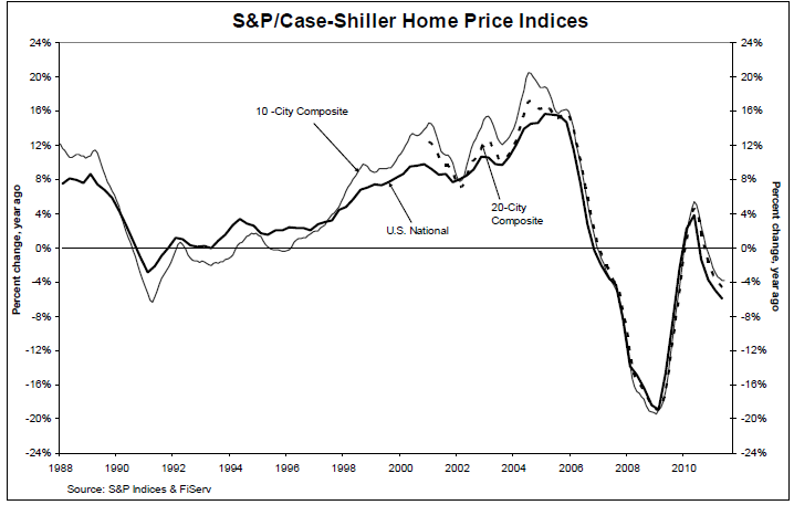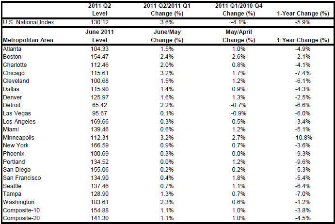 The S&P/Case-Shiller U.S. National Home Price Index, which covers all nine U.S. census divisions, recorded a 5.9% decline in the second quarter of 2011 over the second quarter of 2010. In June, the 10- and 20-City Composites posted annual rates of decline of 3.8% and 4.5%, respectively. Thirteen of the 20 MSAs and both monthly Composites saw their annual growth rates improve, although remaining in negative territory in June.