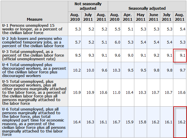 While the "official" unemployment rate is an unacceptable 9.1%, U-6 is much higher at 16.2%.