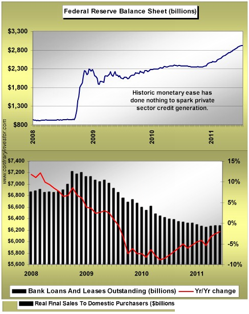 Although it appears obvious conceptually, we’re not so sure the markets yet fully appreciate the fact that in true generational deleveraging cycles, monetary policy is powerless to influence credit expansion. Again, our near myopic focus on credit is driven by the fact that credit is the cornerstone of modern economic development and balance, and certainly not just in the US. The character, availability and price of credit regulate the ongoing tone of aggregate demand, so monitoring credit is simply crucial. If credit cannot expand, then neither can aggregate demand. A simple yet key truism, especially in our current circumstances. As you can see below, we’ve seen literally unprecedented monetary expansion so far in the current cycle, yet private sector credit creation (as is exemplified by the bank loans and leases outstanding) remains wildly subdued at best. The whole pushing on a string thesis? Exactly.