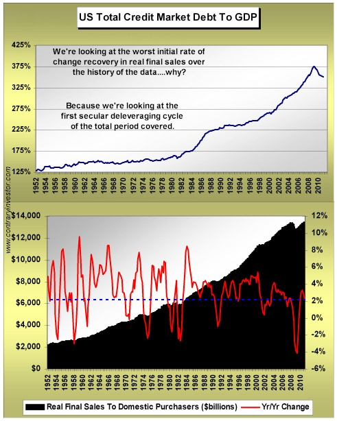 The bottom clip of the chart is one you’ve seen a number of times from us and we believe quite important to what lies ahead. To the point, real final sales to domestic purchasers is GDP stripped of the influence of inventories and exports. What we’re left with is as good look at domestic only GDP and as you can see, the year over year change in terms of growth in the current cycle is the weakest of any initial economic recovery cycle over the time in which official numbers have been kept. Message being? We are seeing very weak aggregate demand, exactly as one would expect in a generational credit cycle reconciliation process.