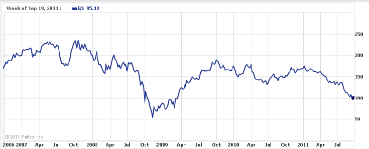 Since he is supposed to be a trader, I’m not sure if he’s looked at GS stock price lately. Quite simply, if Goldman rules the world where governments around the world fail, then GS stock price should not look this ugly — down almost 50% — in the past 24 months: