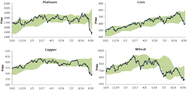 Below are trading range charts for 10 major commodities from the Bespoke Group. All 10 commodities are currently at or below the bottom of their trading ranges, which would suggest at the moment, a good opportunity to get in at oversold levels for investors looking to gain long-term exposure.