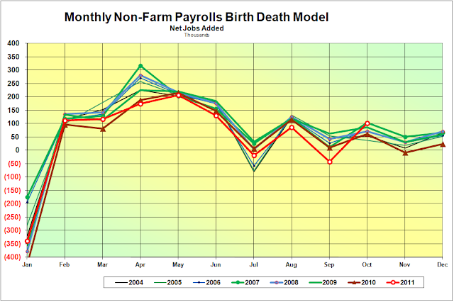 The Birth-Death Model was out of normal to the high side enough to raise a comment. This is shown in the first slide. Lately the BLS statisticians had not resorted to this and had actually been running at estimates a little more to what one might expect in a business slump.