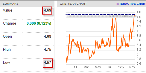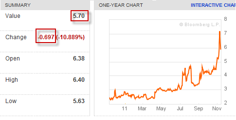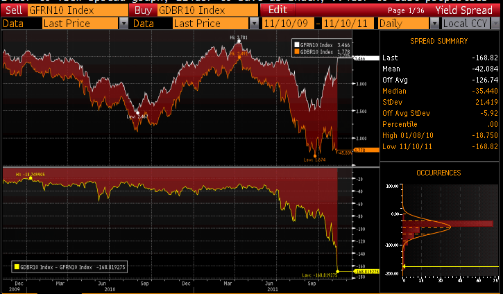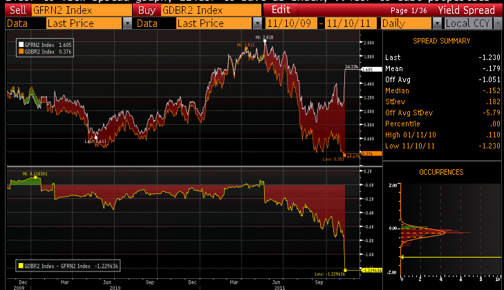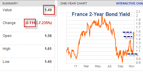 Today’s euphoria is about falling yields on Italian government debt. The yield on 10-Year Italian bonds is down 44 basis points to 6.45%. The yield on 2-year government bonds is down a whopping 70 basis points to 5.70%.