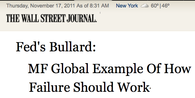 James Bullard (St, Louis Fed head) was on TV this morning. He said a number of things that I thought were off base. The biggest was his comment on the collapse of MF Global.