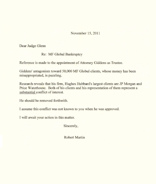 A party associated with The MF Global Customer Coalition has sent a letter to Judge Glenn asking him to reverse the appointment of James Giddens as Trustee for the MF Global Bankruptcy case.