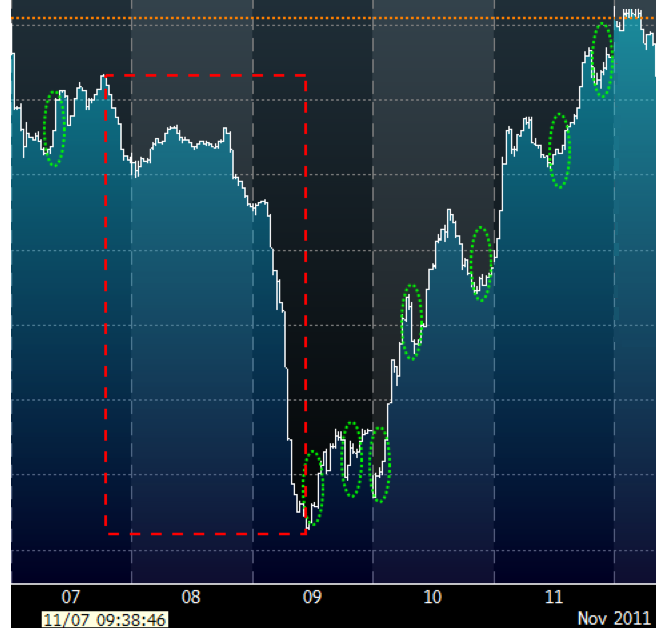The following is a close up of a chart created by Zero Hedge. This segment looks at November 8 through 11. The green circles are the timing of ECB interventions (note market reactions).