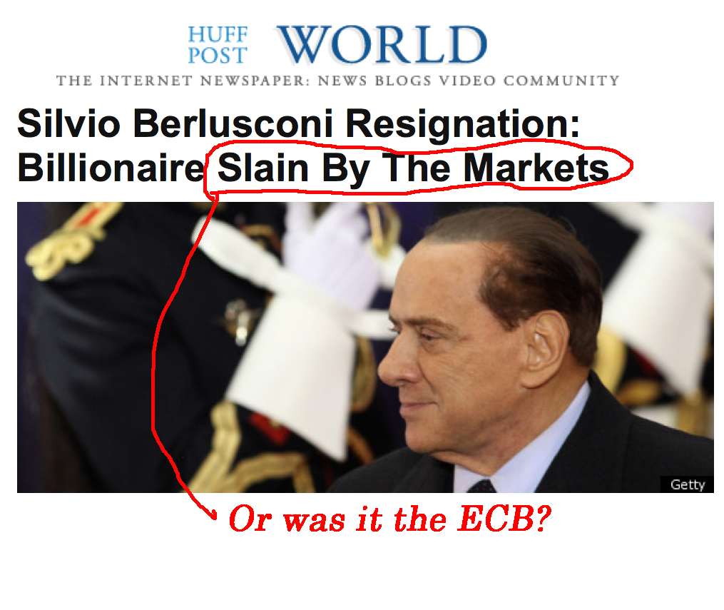 The following headline had it both right and wrong. The bond market did do Berlusconi in. But it was the ECB, behind the scenes, that engineered it so that it would happen.