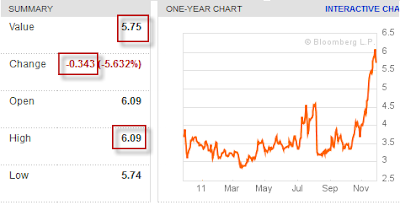 The yield on 10-Year Italian bonds barely budged. In contrast there was wild action in 2-year bonds, opening up at 8.11% then finishing 100 basis points down from the high and 56 basis points lower than Friday’s close. This intraday move is probably another 6-Sigma event.