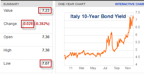 If there was any reason to believe "elite bonds" would help Italy, or the IMF would help Italy, then 2- and 10-year yields would not be above 7%, and the 2-year yield certainly would not have soared to a new high above 8%.