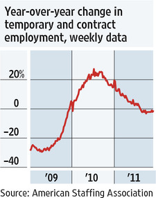 With the labor force dropping y-o-y by 67,000 vs. an expected increase of 1.5 million (125,000 per month) (see Unemployment Rate Dips to 8.6% as 487,000 Drop Out of Labor Force), it is hard to believe this decline is due to employers signing temporary workers on to permanent positions.