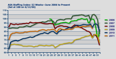To put the above chart in better context, here is a chart of ASA Temporary and Contract Employment Index by the American Staffing Association since 2006.