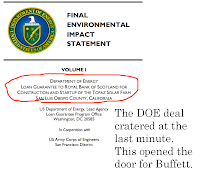 When the DOE money did not come through, it must have been a big blow to the White House. Topaz was a big prize for them. I wonder if Obama called his pal Buffett and asked for a "fix". Warren B. delivered. But, as usual, he charged a pound of flesh. Obama got what he wanted. he avoided another solar disaster when WB stepped