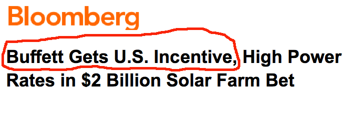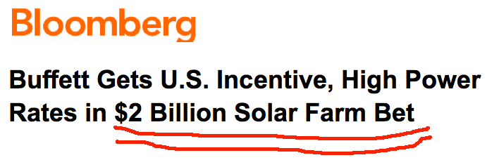 When Topaz is completed, energy will be produced. Pursuant to the PPA Topaz/Buffet will receive checks monthly from PGE for the next 25 years. That stream of revenue is assured. PGE is a single A. Its long-term debt yields are in the mid 4% range. I’m certain that Buffet got a better yield than that. But the yield is not what brought Buffet into the deal. It was taxes and his desire to avoid them that got this deal inked. Again, that Bloomberg Headline: