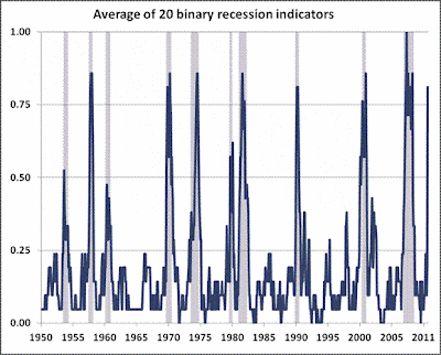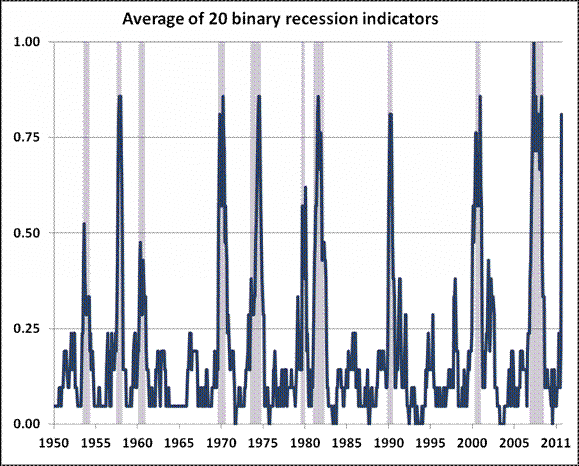 We use a variety of methods to gauge recession risk. The most straightforward is to form fairly low-order indicator sets like our Recession Warning Composite (see November 12, 2007, Expecting A Recession), that have a long historical record of accurately distinguishing recessions.