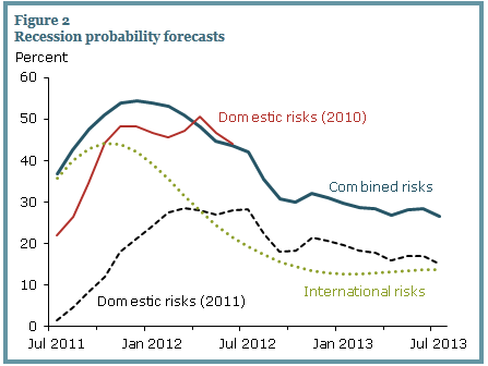 In the next few months, the odds of recession due to domestic factors appear reasonably contained. Those odds increase gradually and reach about 30% in the second half of 2012, after which they decline. However, the curve reflecting the international odds suggests more imminent danger to the economy, although this threat is harder to calibrate using historical data and only indirectly reflects the health of the European financial system. Recession odds based on international factors peak at about 45% toward the end of 2011, but decline rapidly thereafter.