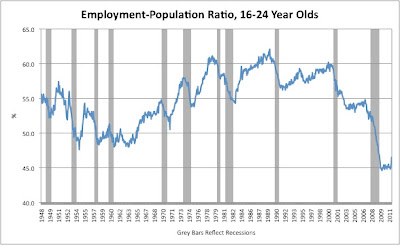 Based on the information provided by the CBO, I think it should have analyzed changing the EEA down (as well as up). Lowering the EEA would be neutral to the long-term finances of both SS and the country. It would also open up a few million jobs. Many of those jobs would be entry level positions. Just what we need. This chart illustrates the problem we face. Employment for younger workers is currently at a post WWII low.