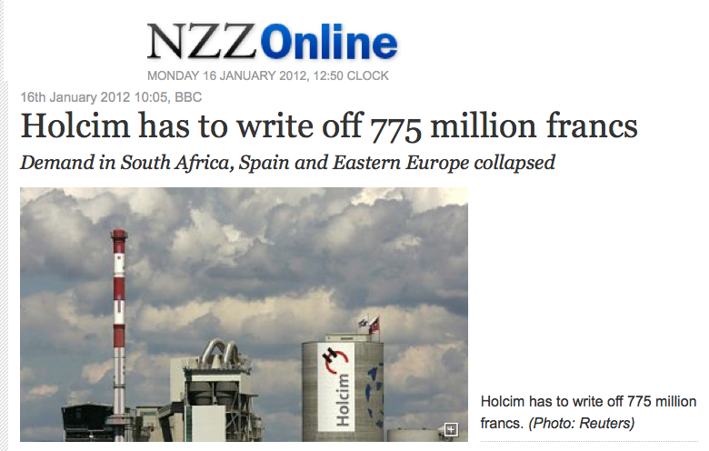 The big Swiss cement company Holcim announced a charge to assets as a result of a write down of fixed assets. Here's the headline and a look at Holcim’s stock performance. Note that the stock got clipped for a 1/3 of it value about 8 months ago.