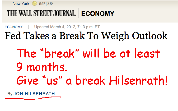 The WSJ article indicates that the Fed is on hold for at least three months, till June. Moreover, Bernanke can’t do anything big on the monetary front within five months before a national election. Therefore, the next legitimate time for another LSAP/QE is in December of 2012.