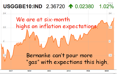 The easy answer to this conundrum is that the Fed will just keep buying more bonds to keep rates artificially low. I say it can’t do that. If the Fed announced tomorrow that it was going to “TWIST” the market to keep the ten-year at 2%, crude would rise to $150 in a month. Bernanke understands that.