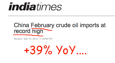 China’s 2011 total trade surplus was $183B. The surplus with the USA was $270B; the US was 150% of China’s total surplus. China imports lots of “stuff.” Crude oil is high on that list. Increased domestic consumption, plus additional imports for strategic storage, have pushed up imports to 6 million barrels per day in February. At that rate, the 2012 import bill for crude will be $250B, approximately equal to the US trade deficit with China.