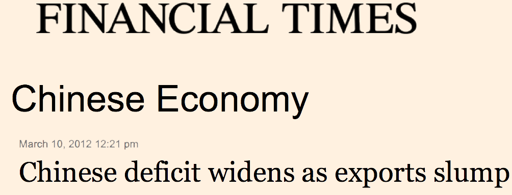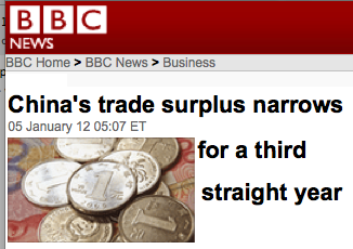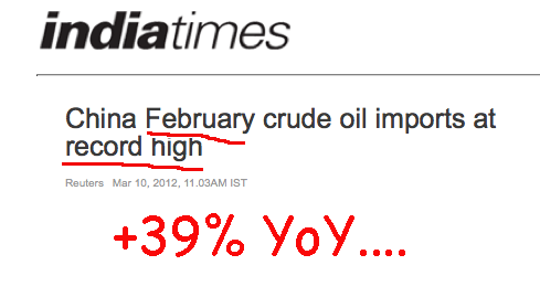China’s 2011 total trade surplus was $183B. The surplus with the USA was $270B; the US was 150% of China’s total surplus. China imports lots of “stuff.” Crude oil is high on that list. Increased domestic consumption, plus additional imports for strategic storage, have pushed up imports to 6 million barrels per day in February. At that rate, the 2012 import bill for crude will be $250B, approximately equal to the US trade deficit with China.