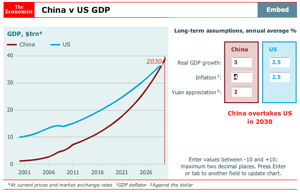 AMERICA'S GDP is still roughly twice as big as China’s (using market exchange rates). To predict when the gap might be closed, The Economist has updated its interactive chart below with the latest GDP numbers. This allows you to plug in your own assumptions about real GDP growth in China and America, inflation rates and the yuan’s exchange rate against the dollar. Over the past ten years, real GDP growth averaged 10.5% a year in China and 1.6% in America; inflation (as measured by the GDP deflator) averaged 4.3% and 2.2% respectively. Since Beijing scrapped its dollar peg in 2005, the yuan has risen by an annual average of just over 4%. Our best guess for the next decade is that annual GDP growth averages 7.75% in China and 2.5% in America, inflation rates average 4% and 1.5%, and the yuan appreciates by 3% a year. Plug in these numbers and China will overtake America in 2018. Alternatively, if China’s real growth rate slows to an average of only 5%, then (leaving the other assumptions unchanged) it would not become number one until 2021. What do you think?