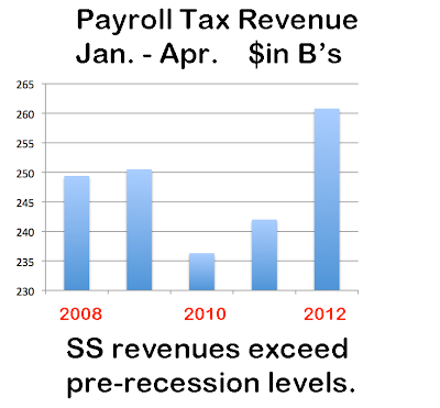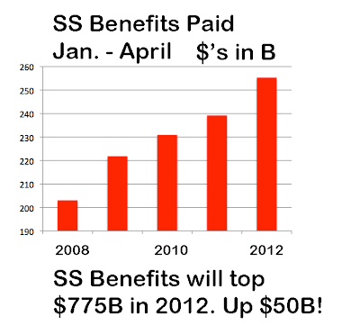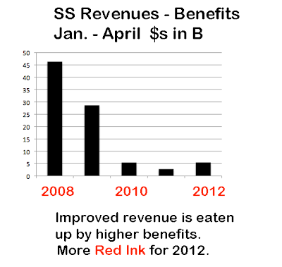 The first four months of the year is a period of high seasonal tax income for SS. Most of the months for the rest of the year will end with cash flow shortages. Based on Jan. – Apr. results for 2012, I forecast a full year cash deficit of $40B (vs. $45.5B of red ink in 2011.)
