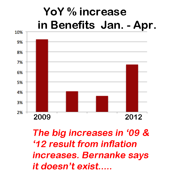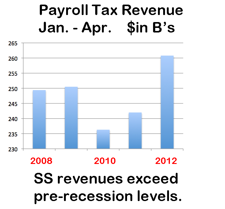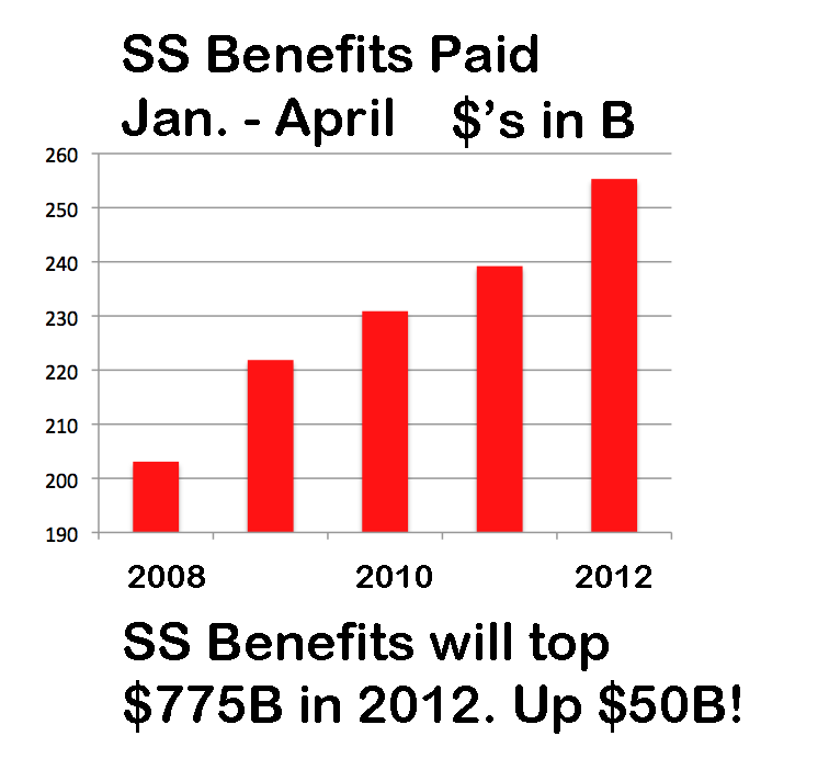 The first four months of the year is a period of high seasonal tax income for SS. Most of the months for the rest of the year will end with cash flow shortages. Based on Jan. – Apr. results for 2012, I forecast a full year cash deficit of $40B (vs. $45.5B of red ink in 2011.)