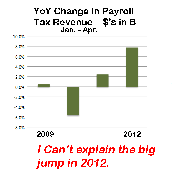 I think that taken together these factors can only account for half of the increase in payroll tax revenue. The other half is a function of more people working. The data suggests there are 1-2 million more people working than the BLS is reporting.