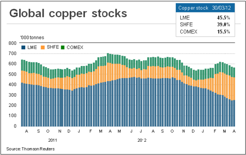 Various projections point to a world copper production deficit of about 250,000 metric tons in 2012 as supply growth continues to lag behind demand growth, and supply and demand is expected to reach balance by 2013. However, analysts estimate that more than 1 million tonnes of mostly unreported commercial stocks of refined copper cathode are currently sitting in warehouses, the highest level since 2009. That's about 4 times of the expected deficit this year, which suggests the current copper market seems more than balanced than most people believe given the slowdown in China's economy.