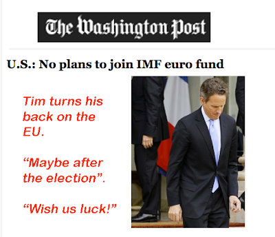 The USA "no-show" at this critical juncture is due to election year politics. Tim Geithner knows that he could not sell Congress (much less the American people) on a plan where US funds are used to bailout the EU, while there is so much pain at home.