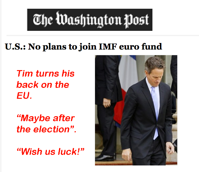 The USA "no-show" at this critical juncture is due to election year politics. Tim Geithner knows that he could not sell Congress (much less the American people) on a plan where US funds are used to bailout the EU, while there is so much pain at home.