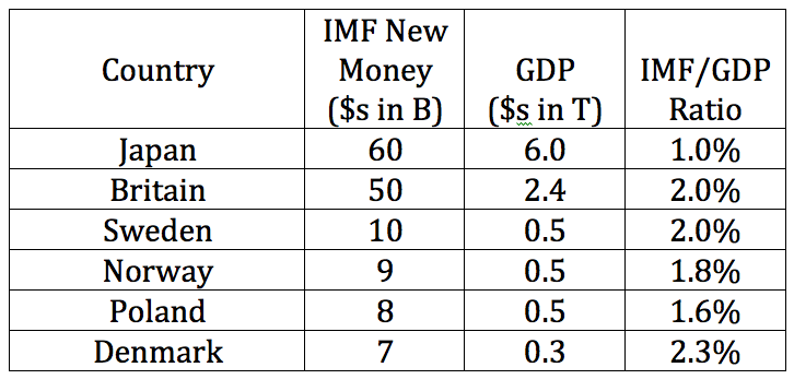 Switzerland has a GDP of $0.6T. Based on the above information, it might be expected to commit about 2% of GDP, or approximately $12B. I suspect the amount will be much higher. The reason is that Switzerland has a mountain of reserves that it has accumulated on the backs of the EU countries. The Swiss have built up these reserves through years of currency intervention. Now it will pay the price that comes with an undervalued currency.