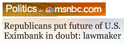 When S&P downgraded the USA, it pointed at political gridlock and the inability of D.C. to agree to confront issues as the principal reason for the downgrade. The fight over Exim is a good example of that gridlock. I’m 70% confident that an Exim "patch" will be in place within the next few weeks. That leaves a 30% chance for this to go wrong. If it gets nasty, it will highlight all that is wrong with the country.