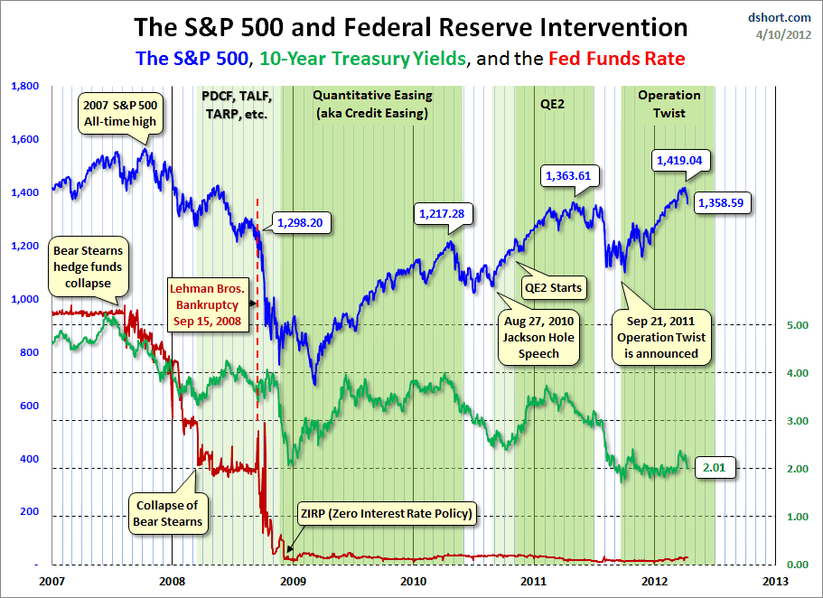 Well, now the pros at dshort.com have made all that possible. They’ve reduced 4 years of monetary policy into one chart that illustrates exactly what the Fed is up-to and who benefits from the policy. Here’s the link.