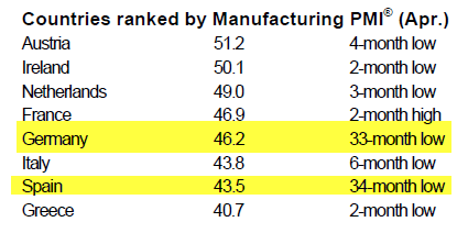 Further causes for concern were sharper rates of decline in output at Italian and Spanish manufacturers, plus an ongoing steep downturn in Greece. Meanwhile, French manufacturing output contracted at a weaker pace than that seen in March.