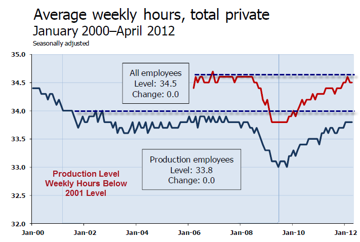 - The average workweek for production and nonsupervisory employees on private nonfarm payrolls was unchanged at 33.8 hours.