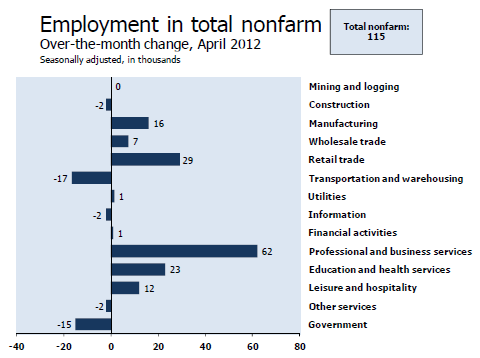Nonfarm payroll employment rose by 115,000 in April, and the unemployment rate was little changed at 8.1 percent, the U.S. Bureau of Labor Statistics reported today. Employment increased in professional and business services, retail trade, and health care, but declined in transportation and warehousing.