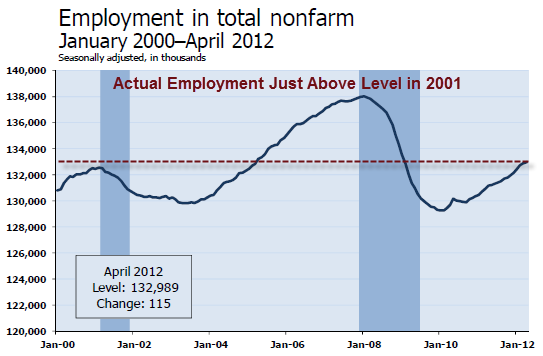 Employment is about where it was just prior to the 2001 recession.