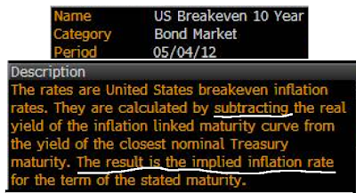 This is pretty simple stuff. Take one number, the prevailing yield on ten-year Treasury bonds, and subtract the yield on the TIPS and presto, we have a future inflation forecast.