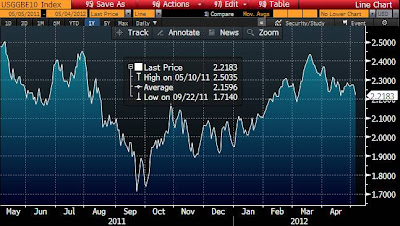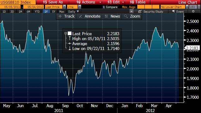 This is the Bloomberg chart for inflation expectations based on the TIPS/Coupon spread. Note that the spread closed at 2.22 of Friday: