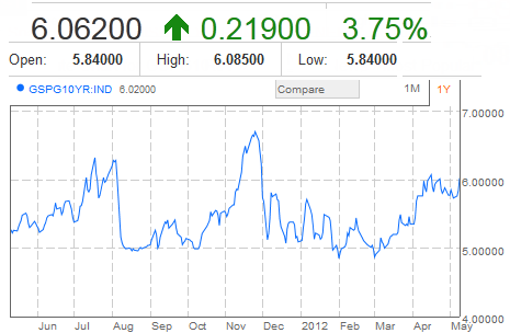 Yield on the 10-year Spanish bond is up 22 basis points to 6.06%, having hit a high of 6.08%.